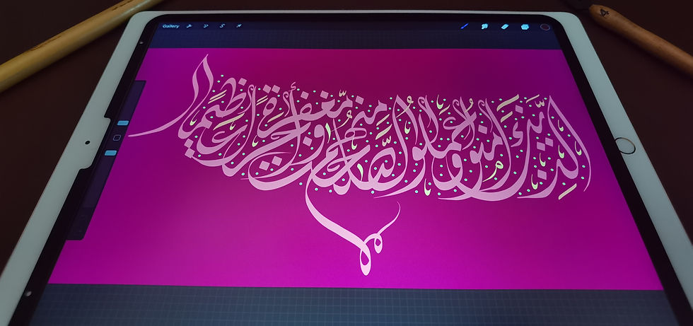 My workflow covers most of the Graphic Designing Programs like Photoshop, Lightroom, Illustrator, 3DS Max, After Effect, and Adobe Audition, with a Good Experience of Arabic Calligraphy in both worlds, the traditional Regular ink, and nibs, or the modern digital calligraphy using iPad and other devices as a medium.
